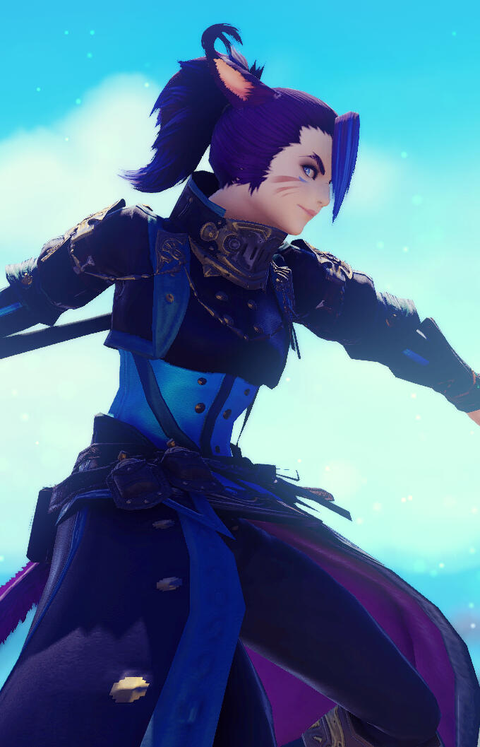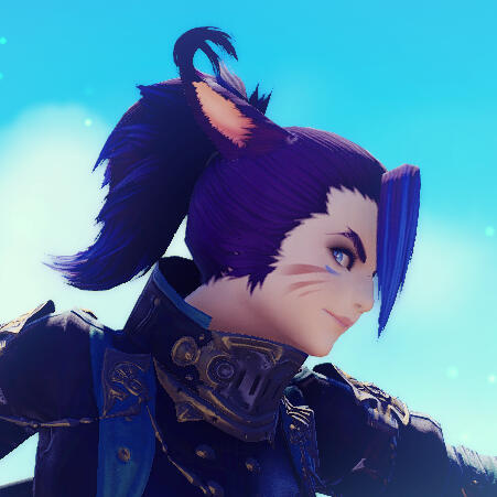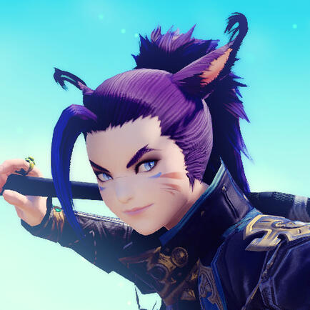 A miqo'te of mixed Seeker and Keeper heritage, Nalukai is an outlier of her race for a plethora of reasons. The first, and arguably most noticeable trait that marks her as unusual is her height; she stands at 5 fulms and 9 ilms, tall for any miqo'te, let alone a woman. Her physique is broad, compact looking from a distance, yet not without curves through the sides. Hips and shoulders appear roughly the same width, limbs stocky and decently toned, ending in wide feet and squared palms, respectively. Motherhood has given her a fuller, slightly padded look particularly through the middle, but signs point to her maintaining a steady enough regiment of physical activity.An angular face with bold features and a strong-looking jaw all but instantly removes her from the 'pretty' category. While not wholly unattractive looking by societal standards, 'handsome for a woman' is a better fit to describe her. Thick brows with split peaks act as something of a border between a broad forehead and slightly sunken eye sockets. The lids and lower brow bones both seem to sport a naturally darker tone than the rest of her pale skin.Her eyes are a bright, pale, stormy blue-gray with the thin pupils associated with those usually of Seeker origin. The faint stripes on her cheeks hold a ruddy tone; three on each side, with an ilm-long scar tracing through the middle stripe on her left cheek. Whatever caused the scar appears to have done it at least twice, as there's a matching streak of silvered, healed flesh over the bridge of her slightly aquiline nose. Her lips are relatively thin, untouched by cosmetics, and prone to lopsided grins or smirks that sometimes display the subtle Keeper fangs hidden behind them.Hair, ears, and tail all have the same shade of deep, chilled violet with only minor deviation. The strands and fibers seem to be fine but plentiful, and hang straight and neatly tended. At the ends of her hair, scattered streaks of glaucous blue can be spotted. A widow's peak sprouts long and angled bangs, the majority of which seem to favor hanging down the right side of her face. Past shoulder length, her hair is usually worn gathered in a loose tail either at the base of her skull or high up the back of it. Sharply pointed ears sprout absurdly long, curled tufts at their ends, the color of which look to be near-black under most lights.Long and densely furred, her tail oft shows itself to be a practical instrument of balance as well as an extension to expression. It can be spotted ticking in a multitude of ways on any given occasion. While not easily noticed, thanks to the thick fur, some spots in what should be the smooth column of bone appear to have slight kinks to them, suggesting poorly-healed breaks in the past.